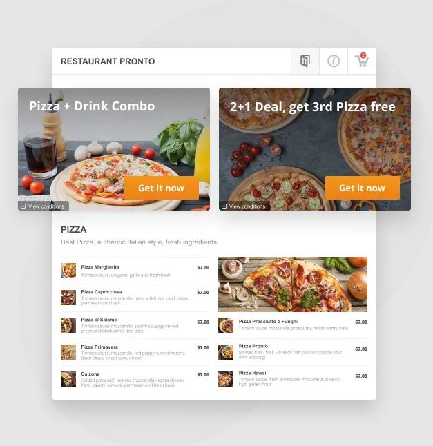 Nuestro sistema gratuito de pedidos online incluye un módulo de promoción de restaurante incorporado para que puedas crear incentivos para la clientela frecuente o nueva.