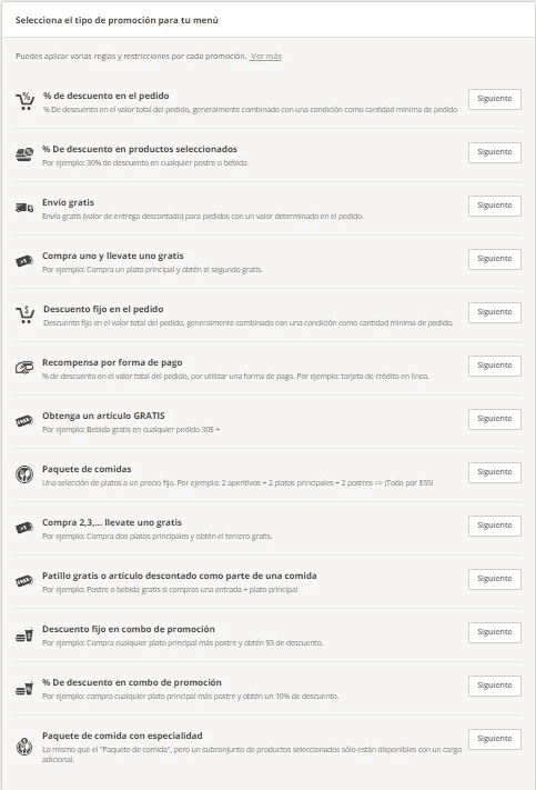 • Promos de comportamiento: primera compra, clientes recurrentes, pedidos a través de un canal de ventas determinado, pedido pagado un medio de pago determinado, Menú del día , combos con especialidad, promos con cupones y mucho más.